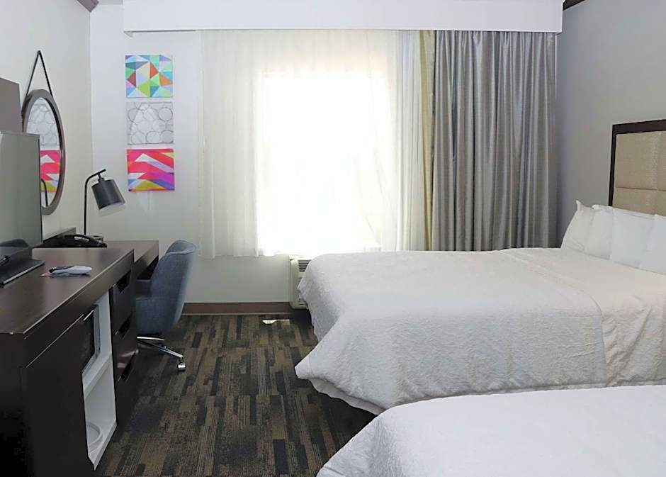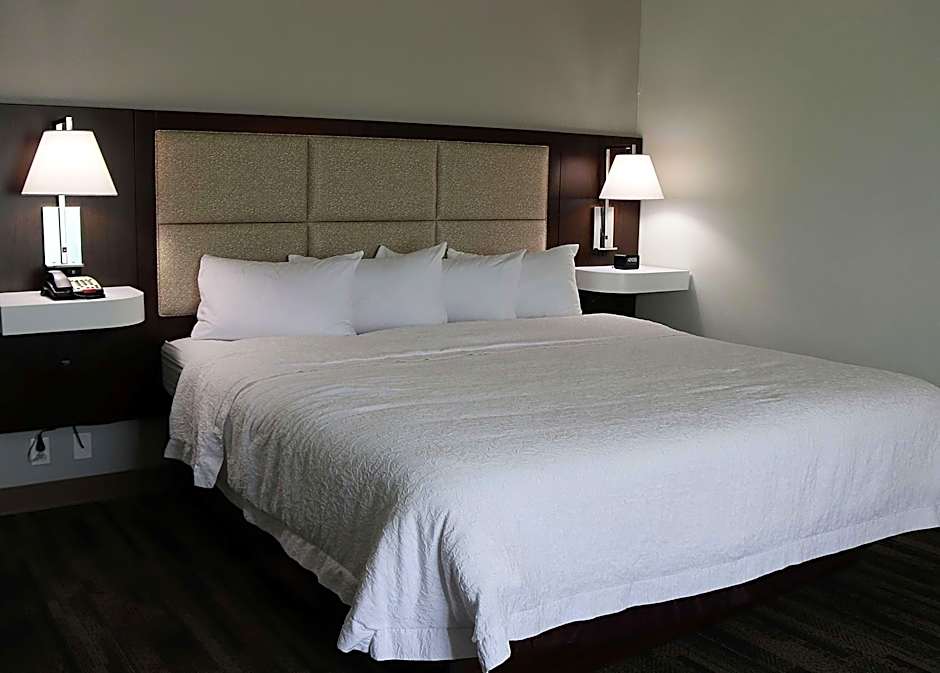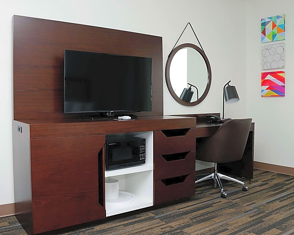 This suite has a refrigerator and microwave and an easy chair and ottoman in the seating area.